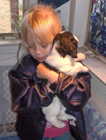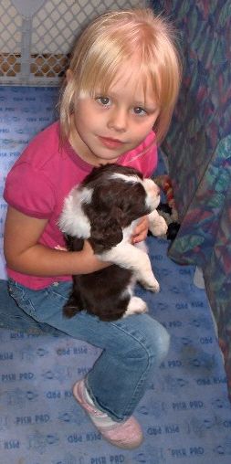 Our granddaughter, Desiree, with her favorite-- the liver/white girl. 5 1/2 weeks old.