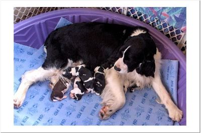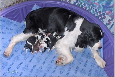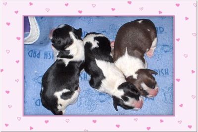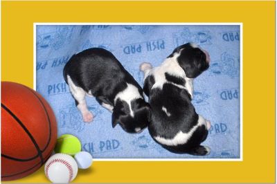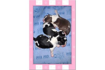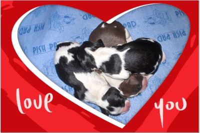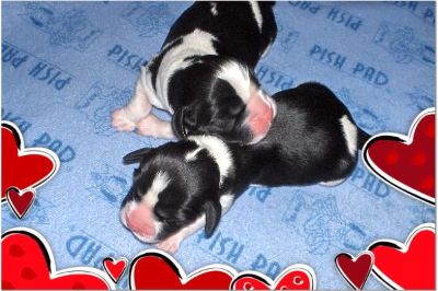 6 puppies. 3 black/white boys. 3 girls, one is liver/white