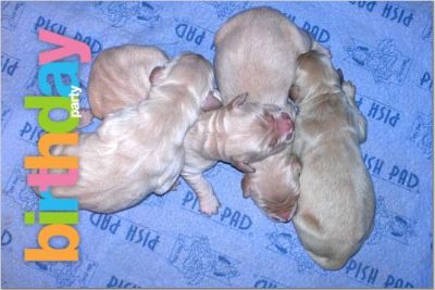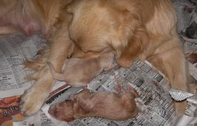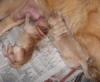 Only 2 puppies... Both girls and are already spoken for. The darker one is actually the same color as her sister, but she is still drying off from being born. They didn't have ANY problem finding the milk!