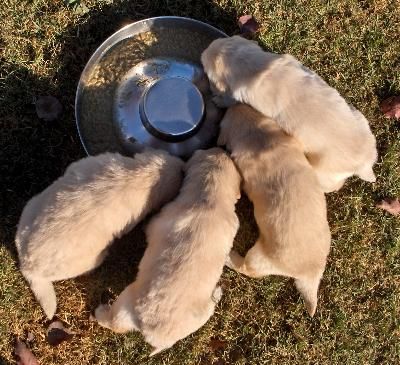 FOUR WEKKS OLD! The pups' first day outside, and their first "not mommy" meal..... Looks like they are enjoying it!