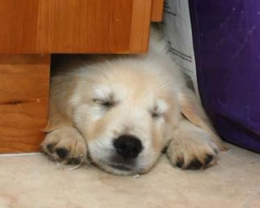 "Greenie" (Bailey) a Pete x Reign puppy making her own cool spot!
