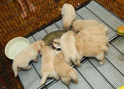 Here is the Pete x Reign litter eating... look carefully, as the next few photos are of some of these pups at their FIRST BIRTHDAY PARTY!