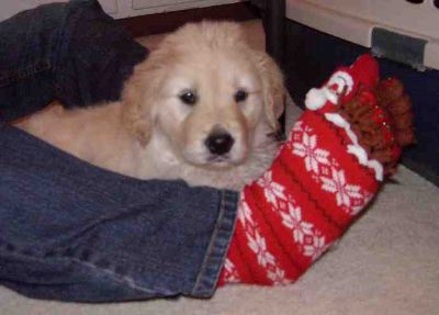 "RedPaw" a Pete x Skittles puppy, after her first bath. She is joined by Santa and eight little reindeer (Heather's socks!).