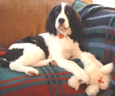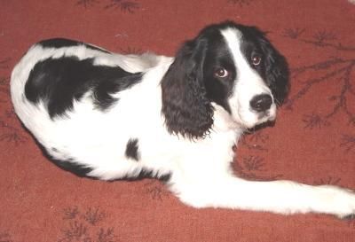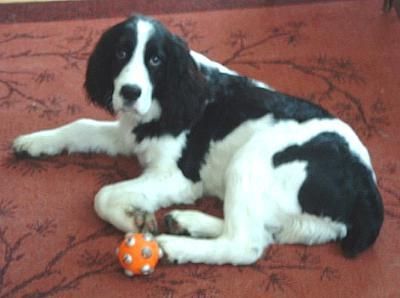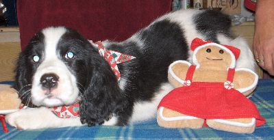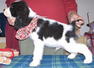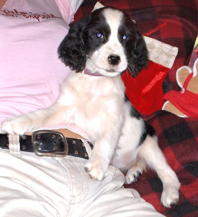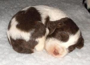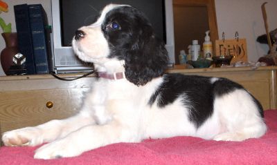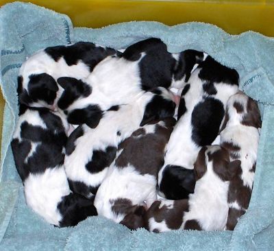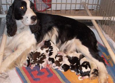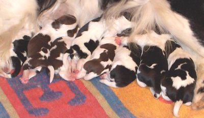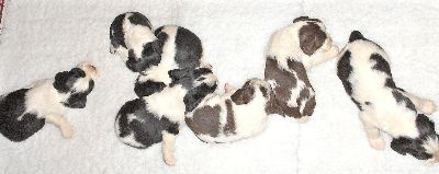 Are these cute or what???!! You can't see it well, but there are 3 liver and white boys, and 5 Black and white pups (one girl). Junior (AKC CH/UCI Int'l CH Promise's Junior Maverick) and Binnie (CH Jester's Ulterior Motive) did a GREAT JOB! To see the 2 we kept go to the Springer Spaniels page and click on Princess Harley or Boomer!