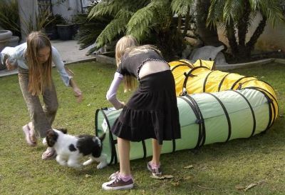 Rachel, Sarah and CHOCOLATE, learning to be an Agility Dog at the tender young age of 3 months!