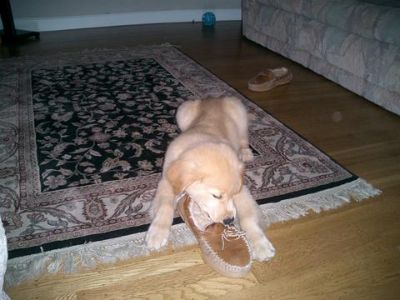 Bella, HELPING to BRING THE SLIPPERS ( NOT eat them...hmmmmm).