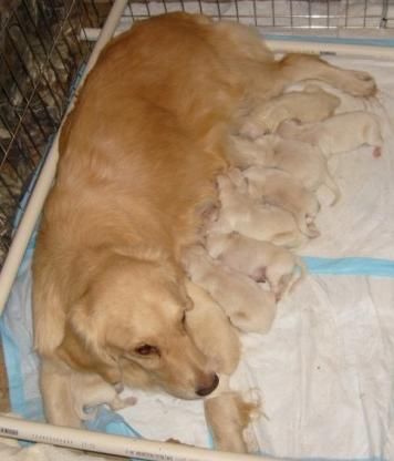 This litter is VERY LIGHT GOLD. Angel has Swedish roots, and Brew is Canadian. Both have Int'l CH titles and are working on UKC champion titles. BIRTHDAY NEWS! 8 babies were born (via C-Section - BIG BLOCKY HEADS!) ON VETERAN'S DAY, 11/11.