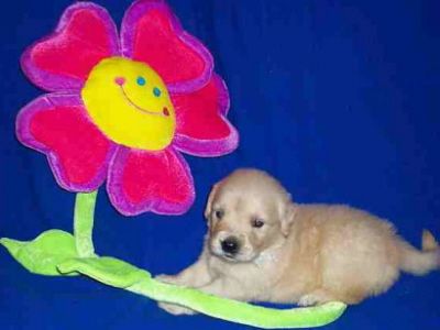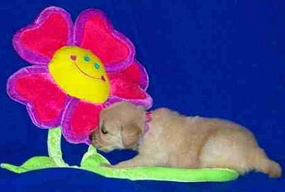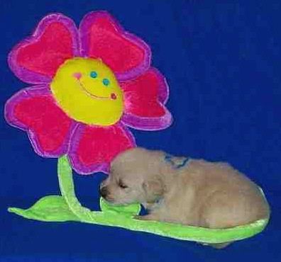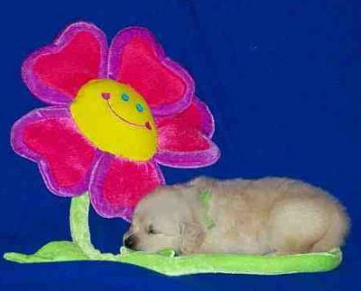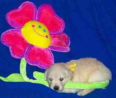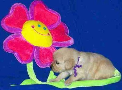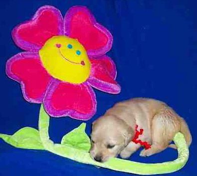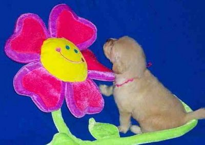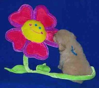 Rainbow girl... hmmm, I wonder if this flower tastes good? Rainbow is such a smart little girl. We hear from her new owners she is doing well with her SIT, COME and DOWN commands as well as getting her potty command figured out. She sleeps through the night too - at 8 weeks old!