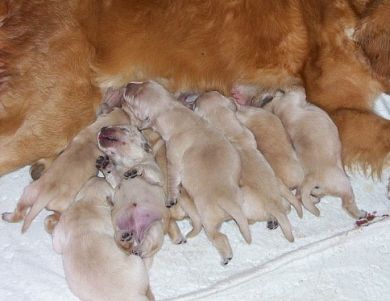 8 puppies were delivered via C-section to Skittles and Brew on May 4th. 7 girls and 1 boy. Mom is recovering nicely and puppies are getting BIG! Hey, I think somebody's FULL!