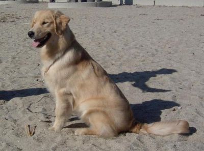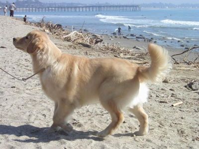 ATTENTION!!! Beautiful dog on beach!!! Beamer is watching a "surfer dude" come out of the water and towards him. Once he figured out it was a person, his tail started wagging like a flag in the wind. Beamer was a true Golden Ambassador throughout his weekend in Southern California. He smoozed with the very young to the very young at heart. He was VERY HAPPY to accept all the attention. To Beamer, age means nothing!