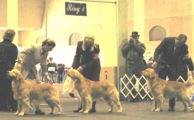 In the ring with "the big boys" at Del Mar, CA in February 2006. Beamer is in the middle. This is the open dog class. He made the cut-- his first weekend out with handler Lynda O'Connor.