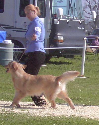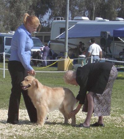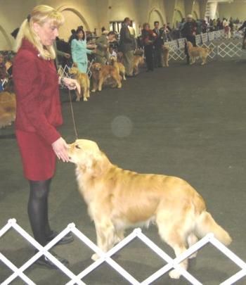 Beamer and Heather in the show ring. The judge goes over each dog as they evaluate them. (March 2005)