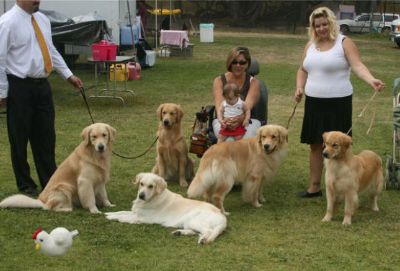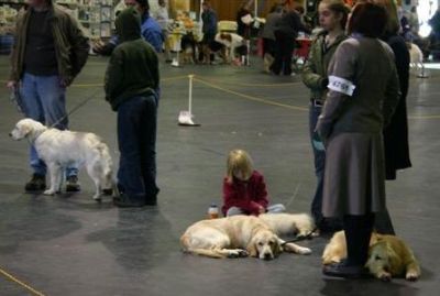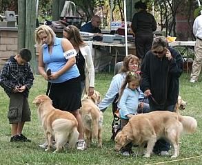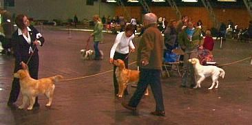 Ringside and waiting...UKC show Modesto, CA 3/17/07. From the foreground backwards, Taylor, Golden Max, Elizabeth (Taylor's Mom), Golden Haley, Marika, Golden Obie (almost out of the pic), Marika's mom Pam (who is holding Jake's leash, but Obie is in the way and you can't really see Jake).