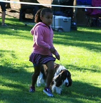 This delightful yong lady is Daniela. She owns Springer Marble. This was her and dad's first dog show. Daniela showed Harley in the Juniors ring. She's getting ready to go in the ring for the first time.... I bet she's trying to remember everything Heather told her!