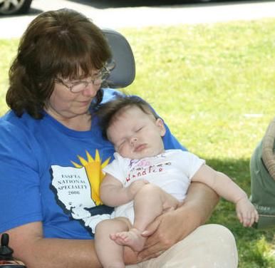 Julane stealing a few ZZzzzsss on Grandma Judy's lap after lunch. Her shirt says, "FUTURE JUNIOR HANDLER".