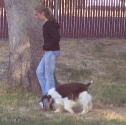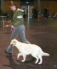 Christine trying to remember everything Heather told her... Keep up the tail, hold up the head, look at the judge, listen to the judge, oops, I should be holding the leash - how was that? (it sure LOOKS easy!).