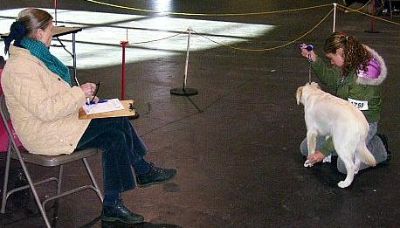 Marika, Haley and the judge... At an Internatinal show, each dog is given a written critique by the judge. Marika is staking Haley (setting her feet where they should be). It was COLD even indoors in Santa Rosa...