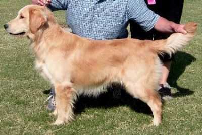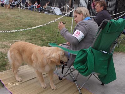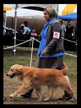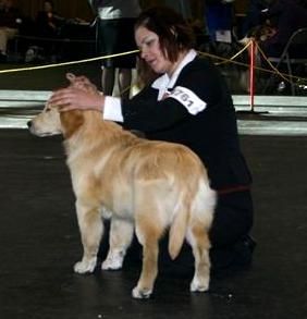 Remmy at almost 6 months... in the ring with Heather at his first show weekend... the Internatonal Dog Show in Santa Rosa, Jan 13-14, 2007. He won Best Of Breed, Bred-by puppy all 4 shows, and won 4 Group FIRSTS. Watch for more show photos of our young puppy as he grows into a mature golden.
