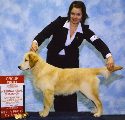 Well, the color is a little off, but here's Remmy's Champion photo after he received his International and National Champion titles--- with his GROUP 1 medals. Int'l show, Santa Rosa, CA January, 2007, at the tender age of 6 months! Heather is his handler.