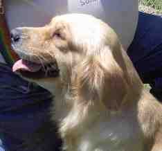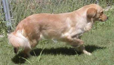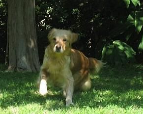 Here's a photo of Skittles, in July, 2007. She is a moderate sized Golden girl. Sweet and unassuming. She is a beautiful medium gold color with lots of feathering, a broad, nicely shaped head, and a smile for everybody! Skittles has stolen our daughter Jennifer's heart, so she will be staying in Sacramento for a while...(Jennifer says "forever")...