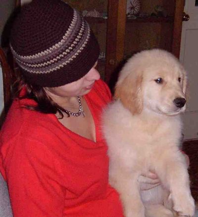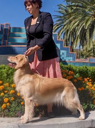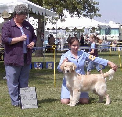 Just shy of being 6 months old, Faith was shown in the puppy "Fun Match" at the Sun Maid Kennel Club show in March 2005 where she won over older Goldens for Best Of Breed, and got a Group 3! She was awarded a beautiful rosette and a fuzzy, squeaky toy (a woobie), which she proudly carried around with her for the rest of the day! Heather did a wonderful job showing Faith.