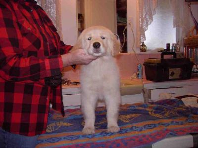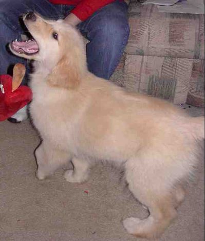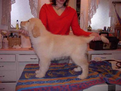Beautiful Faith, being stacked after her bath. She is going to be one special show dog! Nice level topline, good rear angulation, wonderful dark pigment around expressive eyes and well-colored nose with a great profile. Taken 12/4/04.