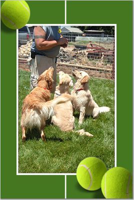 Some of the goldens playing catch (there's a ball out there in somebody's mouth!).