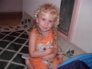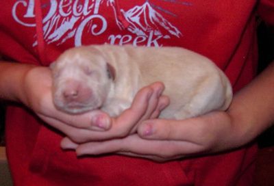Hey Mom, CAN I KEEP HIM??? My nephew's daughter seems to be in love, and who can blame her? The puppies are 10 days old. Even though they can't see us or hear us yet, we hold them and take time with each one every day. This helps them become better adjusted puppies and dogs when they grow up.