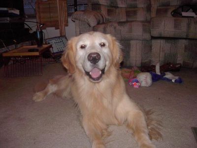 SMILE!! This is the picture we used for Pete's Certified Therapy Dog Badge. More pictures and info on Pete can be found on the RETIRED & RELAXIN' page.
