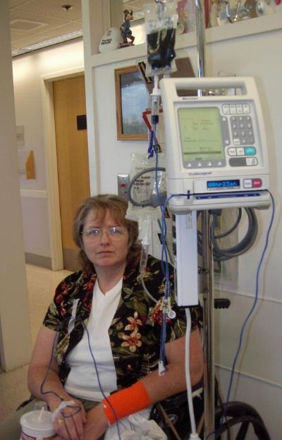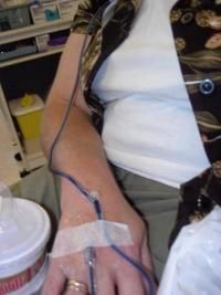 Are you asking, "What in the world does ART and CHEMO have in common?!" The answer is....JUDY! You may not be able to see it very well, but the Chemo drug (called Novantrone - a fairly new drug in the fight against MS for "special" progressive types) is a rich blue color. Since Judy is an artist, she figures she must have run out of blue, and NEEDS A REFILL!