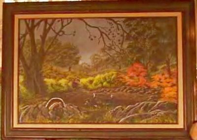 Here it is, completed... Remember, Judy is an ARTIST, not a photographer! It isn't a very good picture, much darker than the painting, but try to pick out all 5 wild turkeys... and yes, this is a 30 x 40 canvas that I painted for the Sanger chapter of the National Wild Turkey Federation. Does it look ANYTHING like the underpainting above???